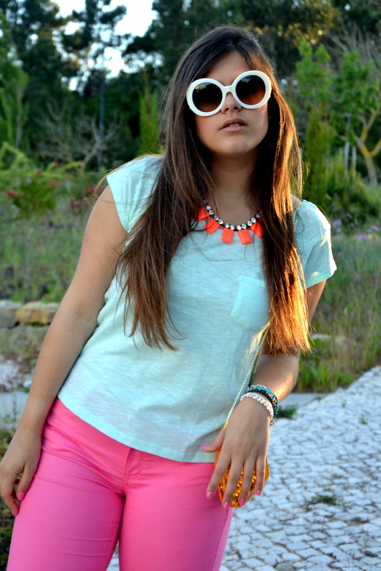 Com este optimo tempo que tem feito, não pude resistir a usar combinações cheias de cor. Eu adoro neons e acho que ficam muito bem quando misturados. Neste verão, não tenham medo de misturar várias cores vivas no mesmo look, desde que as peças forem de uma só cor. É preciso ter atenção quando se mistura padrões, não queremos parecer que estamos a usar umas peças antigas de patchwork! :)